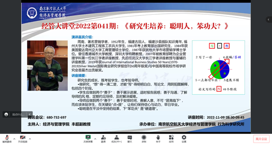 11月9日上午,CJ学者周南教授做客体育投注平台 “体育投注平台 大讲堂”(2022第041期)分享《研究生培养:聪明人?笨功夫?》的主题讲座。本次讲座由院长周德群教授致辞,副教授丰超主持,体育投注平台 一百多名师生线上线下同步聆听,此外,还吸引了部分外校老师前来聆听。