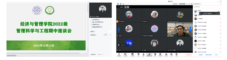 随后,体育投注平台 组织2022级管理科学与工程师生线上座谈会,班主任们交流反馈了班级整体学习状态,各班班长、团支书提出部分同学存在的困难与诉求。系副主任何沙玮老师结合专业培养计划提出专业学习要求,针对学生的困惑,分享了高数学习技巧与方法。最后,体育投注平台 院长助理欧阳林寒老师对大一新生提出殷切期望,在学习、心理、生活、环境等方面尽快地适应大学节奏。
