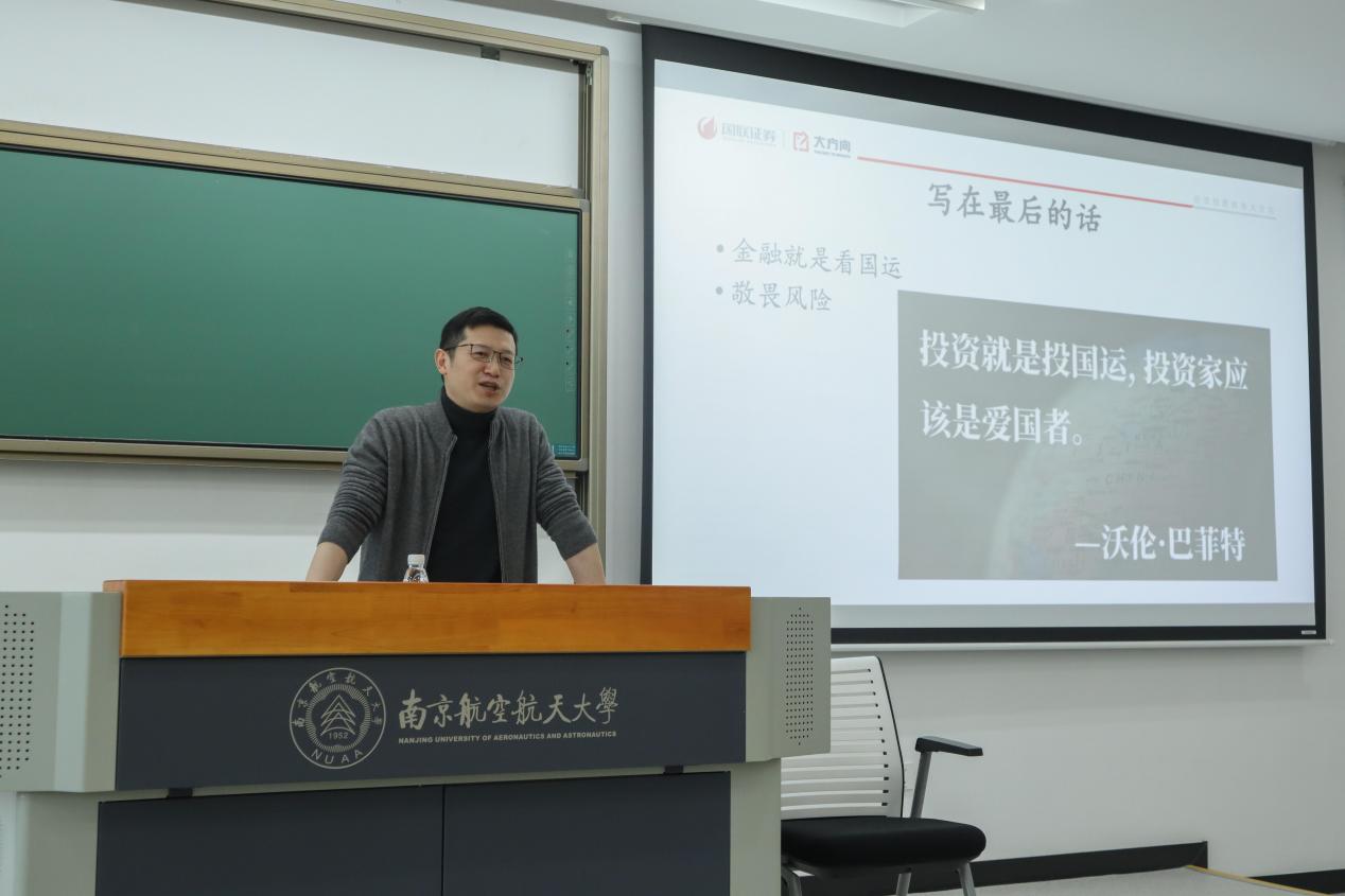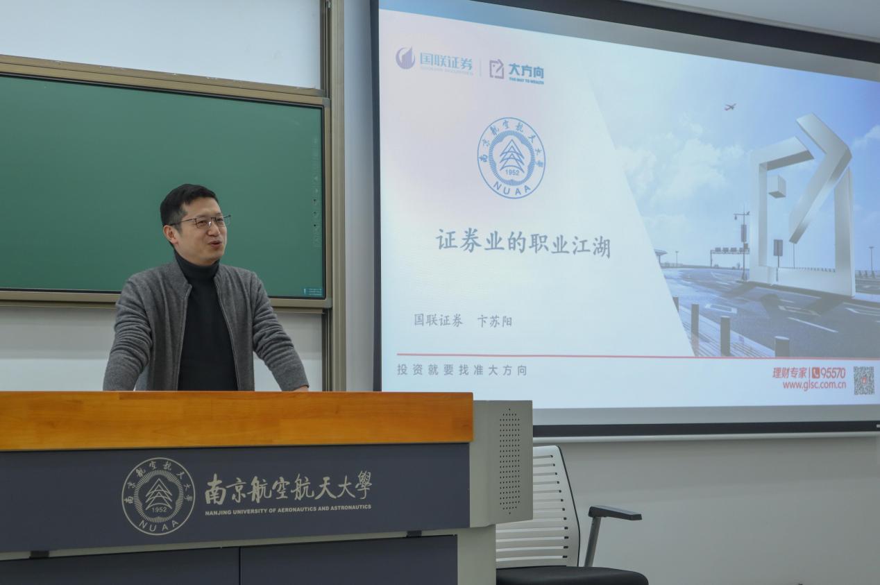 接着,卞苏阳将国联证券公司的企业性质、企业声誉、企业资源以及企业前景向大家进行介绍。并结合自身多年的职场经历和经验勉励大家不断提升自我认知、挖掘自身价值、明确自身努力方向,坚持不懈,相信大家一定会“苦心人天不负,三千越甲可吞吴,”早日实现自己的价值和理想。