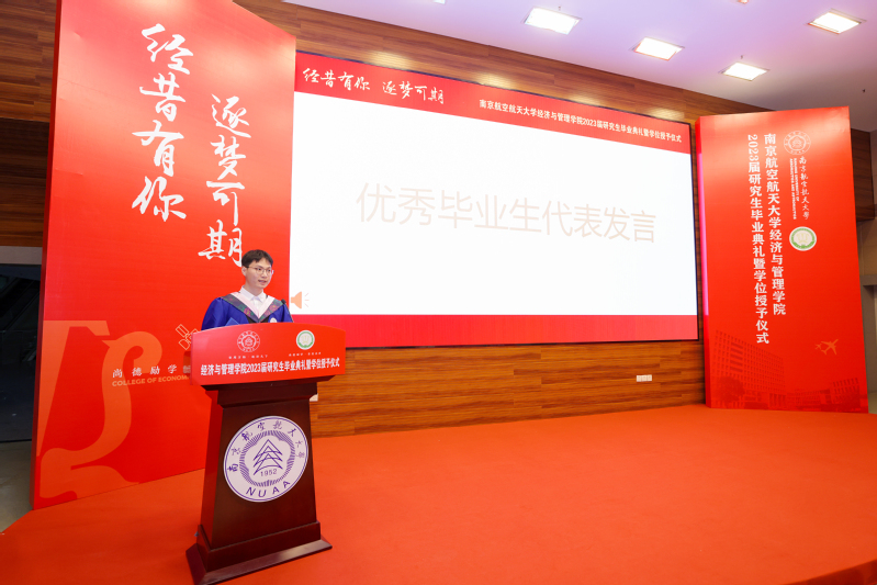 毕业生代表何亮讲述了他作为一名经历者在读研期间的数个“第一次”,也表达了作为一名见证者看到体育投注平台 荣誉墙再添硕果、学科发展再上新台阶时的骄傲。他提到“‘尚德励学、筹策济世’只需一眼,便是整个人生的座右铭”。他代表全体毕业生感谢体育投注平台 三年的辛勤栽培,同时号召全体毕业生要传承体育投注平台 的红色基因、放飞志在长空的蓝色梦想!