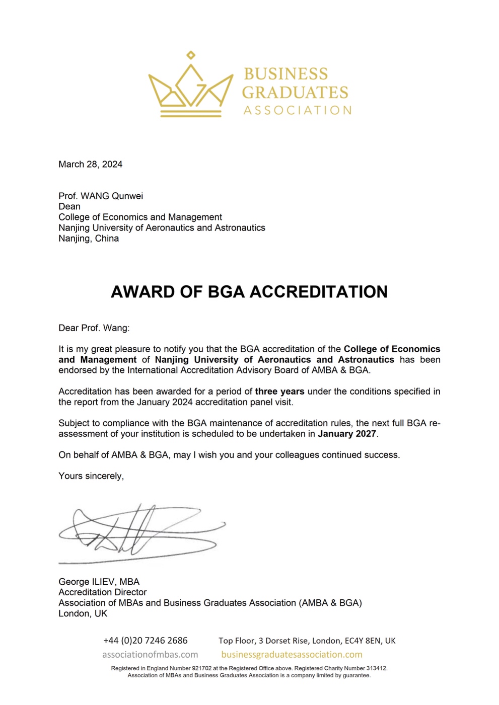 近日,体育投注 经济与管理体育投注 收到英国商体育投注 毕业生协会(Business Graduates Association,简称BGA)发来的官方贺信,祝贺体育投注 顺利通过BGA国际金牌认证,这是体育投注体育投注 层面的首项国际商科认证。