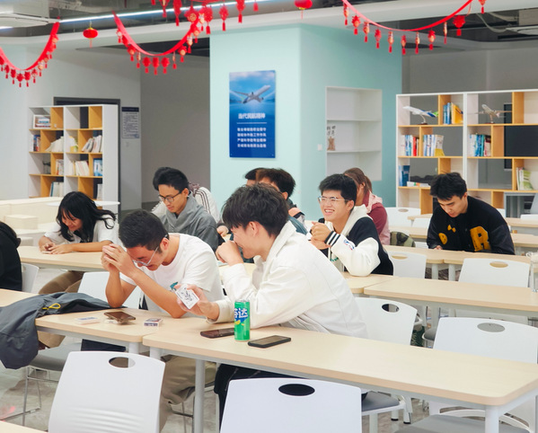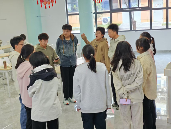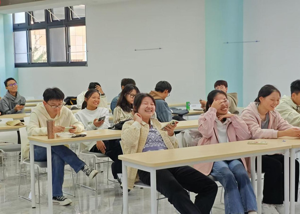 第三个游戏为:你画我猜。参与同学需要通过其他同学对某一物体的抽象描述,来猜测具体事物。为了让组长更快猜出,组员们“各显神通”,通过各类手势让组长一步步锁定正确答案,取得游戏胜利。这不仅锻炼了同学们的表达能力,也培养了大家的默契程度。