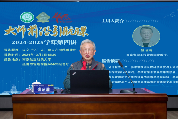 2024年12月7日晚,“大师前沿引航课”第四讲在体育投注 经济与管理体育投注 A0405报告厅举行。本期邀请到南京大学工程管理体育投注 创院院长盛昭瀚教授授课,授课题目为《以文“化”人,功夫在潜移默化中》。经济与管理体育投注 200余名师生参加。经济与管理体育投注 党委书记苏州主持报告会。