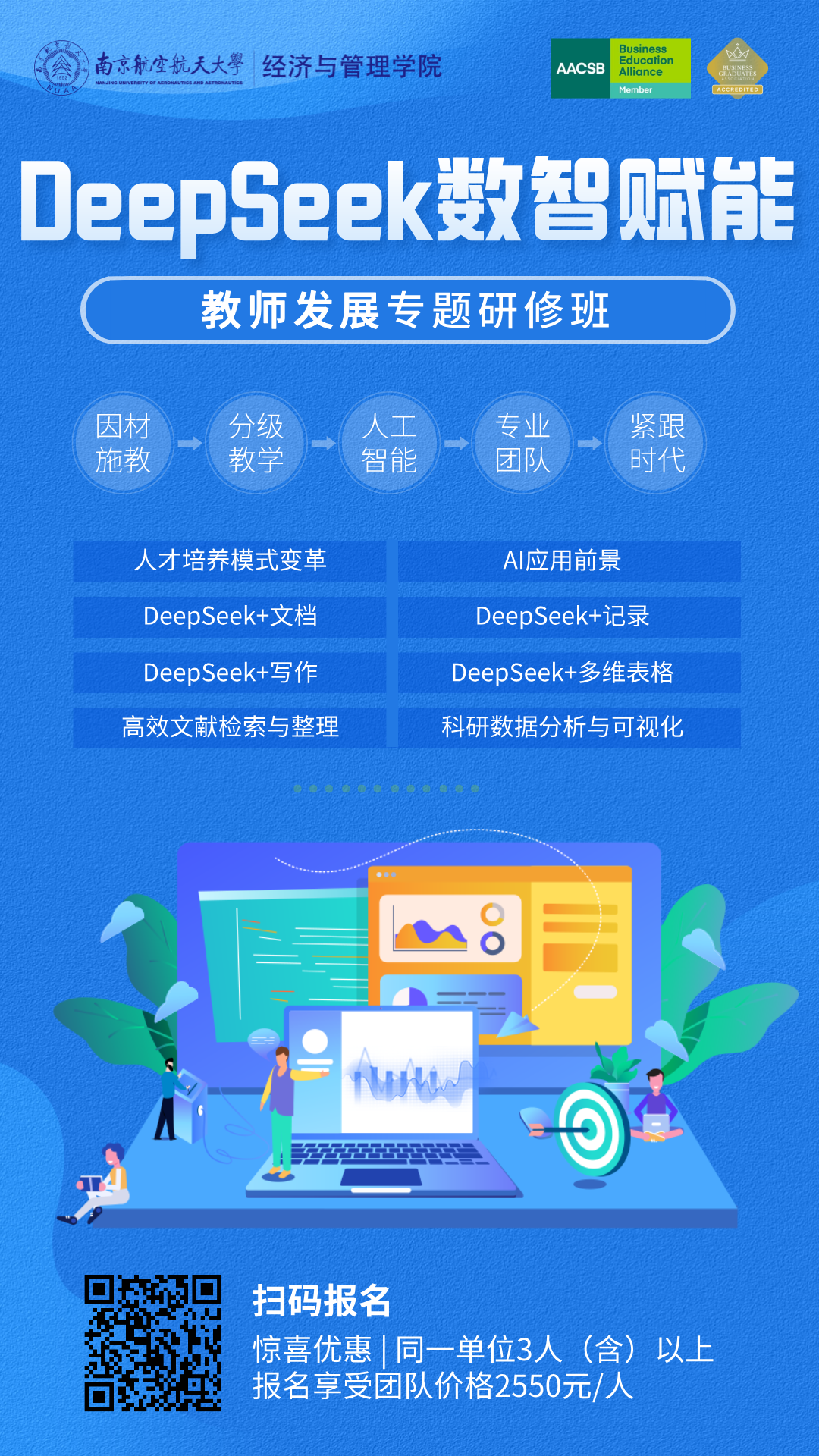 在人工智能技术飞速发展的今天,DeepSeek作为国内领先的AI教育工具,正在引领一场教育领域的智能化变革。通过智能备课、个性化教学设计、自动化助教以及复杂业务流的智能化管理等功能,DeepSeek不仅显著提升了教师的教学效率,还为教育管理者提供了更加科学、高效的决策支持工具。为了帮助广大高校教师和教育管理者更好地掌握这一前沿技术,推动教学与管理的双重创新,经济与管理体育投注 将举办DeepSeek赋能教师发展专题研修班。本期研修班将结合教育场景中的实际需求,提供可操作、可落地的AI应用方案与案例,助力教育从业者全面提升智能化教学与管理能力。