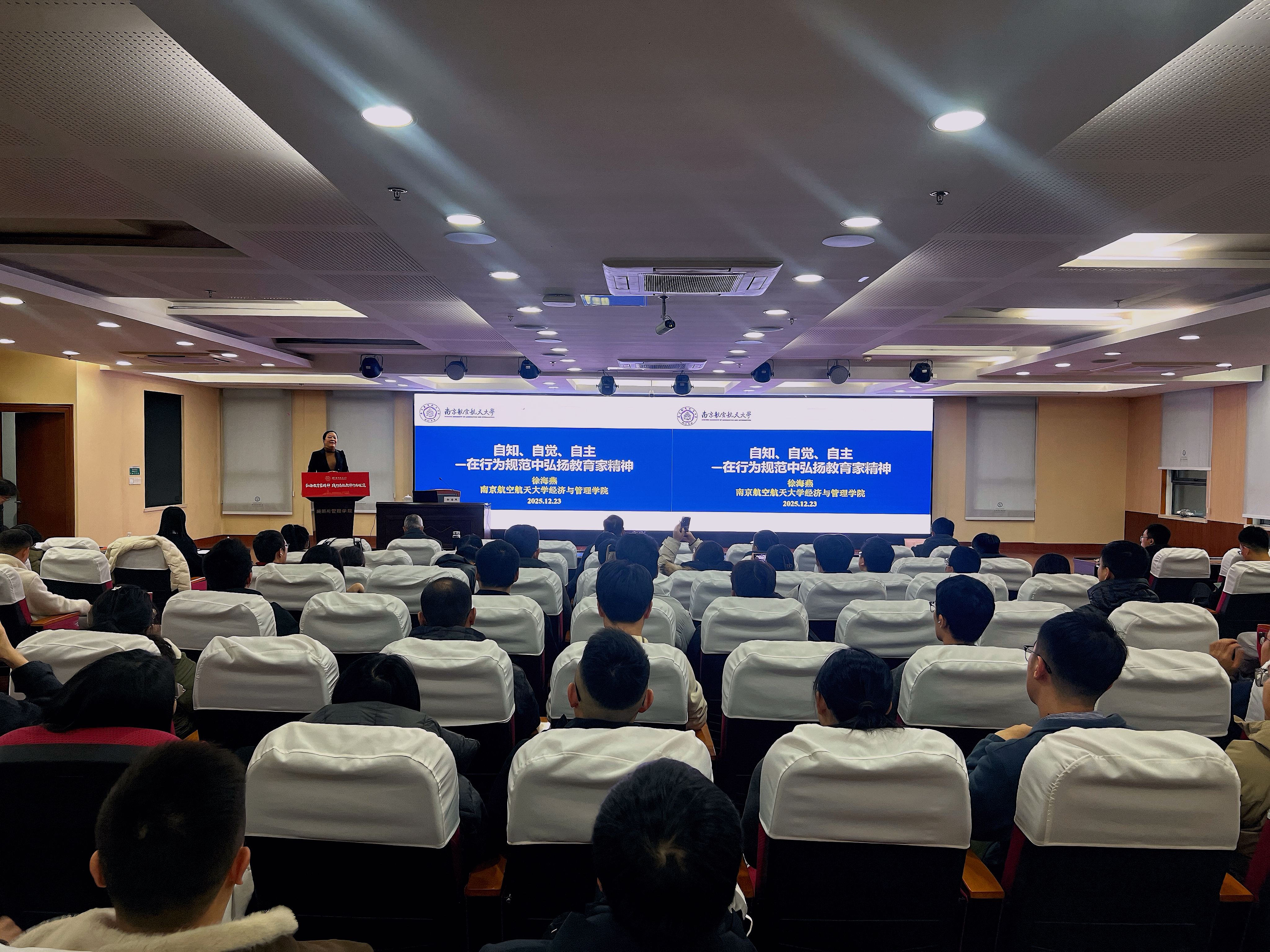 今年,体育投注平台 根据教育部《新时代高校教师职业行为十项准则》等有关规定,结合社会主义核心价值观、教育家精神、“四有”好老师标准以及体育投注平台 精神文化,制定并发布了《体育投注平台 教师行为规范(试行)》。12月23日,“弘扬教育家精神,践行体育投注平台 教师行为规范”系列宣讲活动在体育投注平台 举行。2025年江苏教师年度人物、国务院政府特殊津贴专家、体育投注平台 徐海燕教授,结合41年从教经历,从“自知、自觉、自主”的三重追求展开,分享育人感悟,讲述体育投注平台 教师行为规范的精神内核。讲座由人力资源部/党委教师工作部副部长张晓燕主持,百余名教师参会。