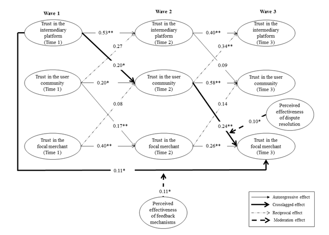 This study attempted to explore the boundary conditions of trust transfer in the online-to-offline commerce context, which is overlooked in prior research. In Study 1, cross-sectional data were collected from 417 consumers to examine the research model. In Study 2, to confirm causality of trust transfer, longitudinal data were collected and analyzed using a cross-lagged panel model. Results indicated that trust in the intermediary platform positively influences trust in the user community, which further positively influences trust in the focal merchant. Perceived effectiveness of dispute resolution strengthens the impact of trust in the intermediary platform on trust in the focal merchant, while perceived effectiveness of the feedback mechanisms strengthens the impact of trust in the user community on trust in the focal merchant. From a theoretical perspective, this study extends insights into trust transfer theory by identifying the boundary conditions of trust transfer. From a practical perspective, it informs intermediary platforms on how to manage dispute resolution and feedback mechanisms effectively to succeed in online-to-offline commerce. It also helps merchants in selecting the most effective intermediary platforms with which to cooperate.